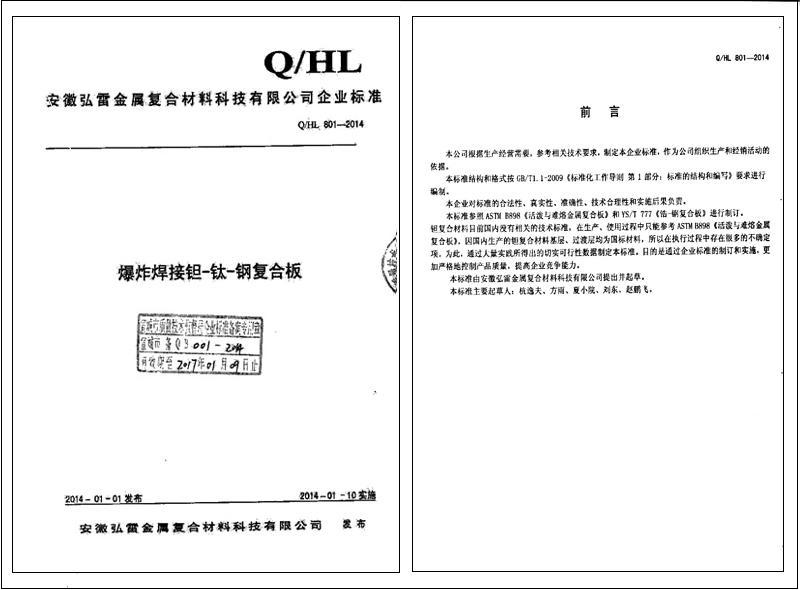 ??? 通過(guò)我司技術(shù)人員的努力,《Q/HL801-2014爆炸焊接鉭-鈦-鋼復(fù)合板》企業(yè)標(biāo)準(zhǔn),于2014年01月01日順利通過(guò)宣城市質(zhì)量技術(shù)監(jiān)督局企業(yè)標(biāo)準(zhǔn)審核備案,并于2014年01月10日實(shí)施。